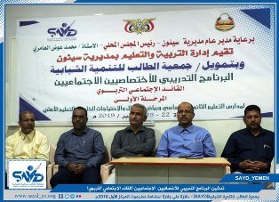 دشن مدير عام مديرية سيئون الأستاذ محمد عوض العامري بثانوية الصبان انطلاق المرحلة الأولى من البرنامج التدريبي للأخصائيين الاجتماعيين لمدارس التعليم العام ورياض الأطفال والاحتياجات الخاصة بمديرية سيئون تحت عنوان ( نحو تعزيز وتحسين العمل الاجتماعي في مدارسنا ) وذلك للفترة من 22 – 25 ديسمبر 2019م بتمويل من جمعية الطالب للتنمية الشبابية.