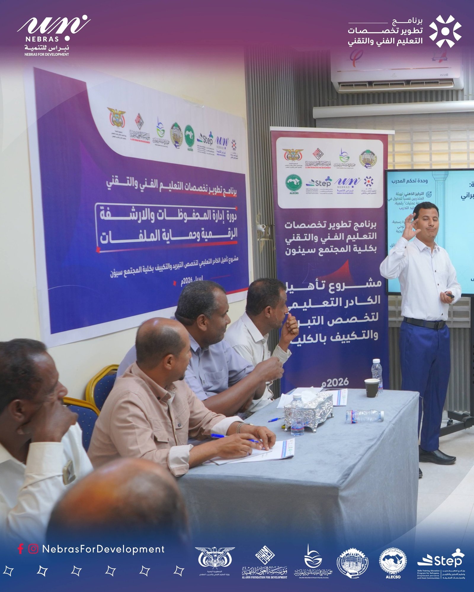 في إطار مشروع تأهيل الكادر التعليمي لتخصص التبريد والتكييف بكلية المجتمع سيئون التابع لبرنامج تطوير تخصصات التعليم الفني والتقني بالكلية، تأتي دورة إدارة المحفوظات والأرشفة الرقمية وحماية الملفات كإحدى المبادرات النوعية التي تهدف إلى بناء تعليم تطبيقي حديث وتطوير الأداء الإداري وتعزيز كفاءة إدارة الوثائق وفق أحدث الممارسات.