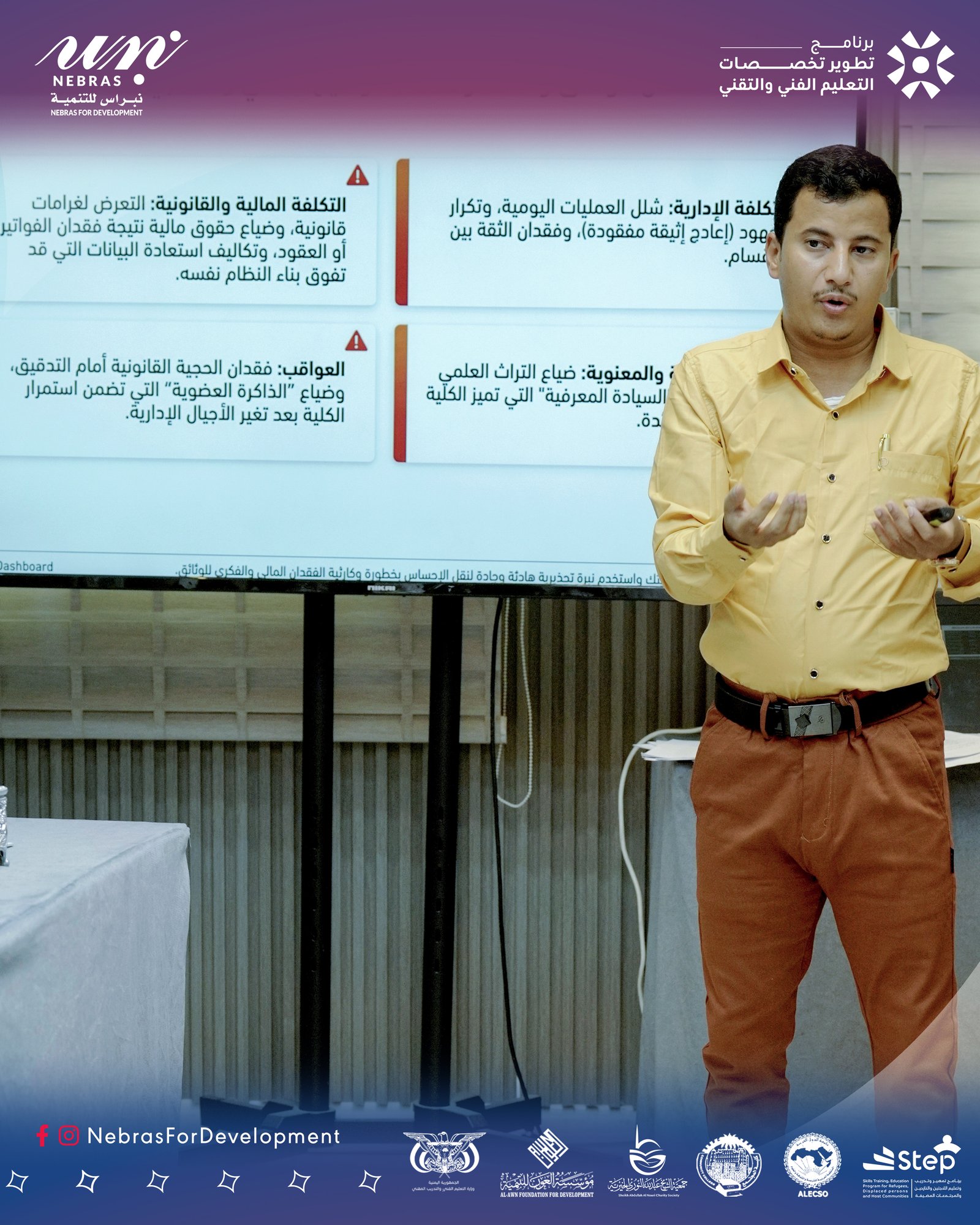 تأتي دورة إدارة المحفوظات والأرشفة الرقمية وحماية الملفات بدعم وتمويل من مؤسسة العون للتنمية ، وبإشراف وزارة التعليم الفني والتدريب المهني، وتنفيذ Nebras For Development