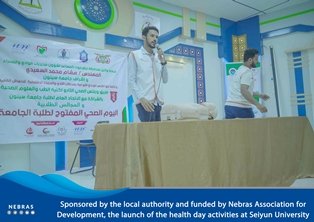 The General Union of Seiyun University Students, in partnership with the Wellness Health Team of the College of Medicine and Health Sciences, and funded by Nebras Association for Development, organized an open health day for Seiyun University students, which was attended by the Assistant Undersecretary of Hadramout Governorate for Valley and Desert Affairs, Prof. Abdel-Hadi Al-Tamimi, President of Seiyun University, and Prof. Muhammad Ashour Al-Kathiri and a number of college deans.