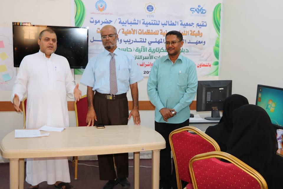 بتمويل من جمعية الطالب للتنمية الشبابية وشبكة النماء اليمنية للمنظمات الاهلية بوادي حضرموت وبالتنسيق مع مؤسسة الأمل للأستشارات دشن بمعهد التفوق المهني للتدريب والتأهيل بسيؤون صباح يوم الأحد برنامج دبلوم السكرتارية الالية ( حاسوب ) للطالبات من الاسر النازحة جراء الحرب باليمن .