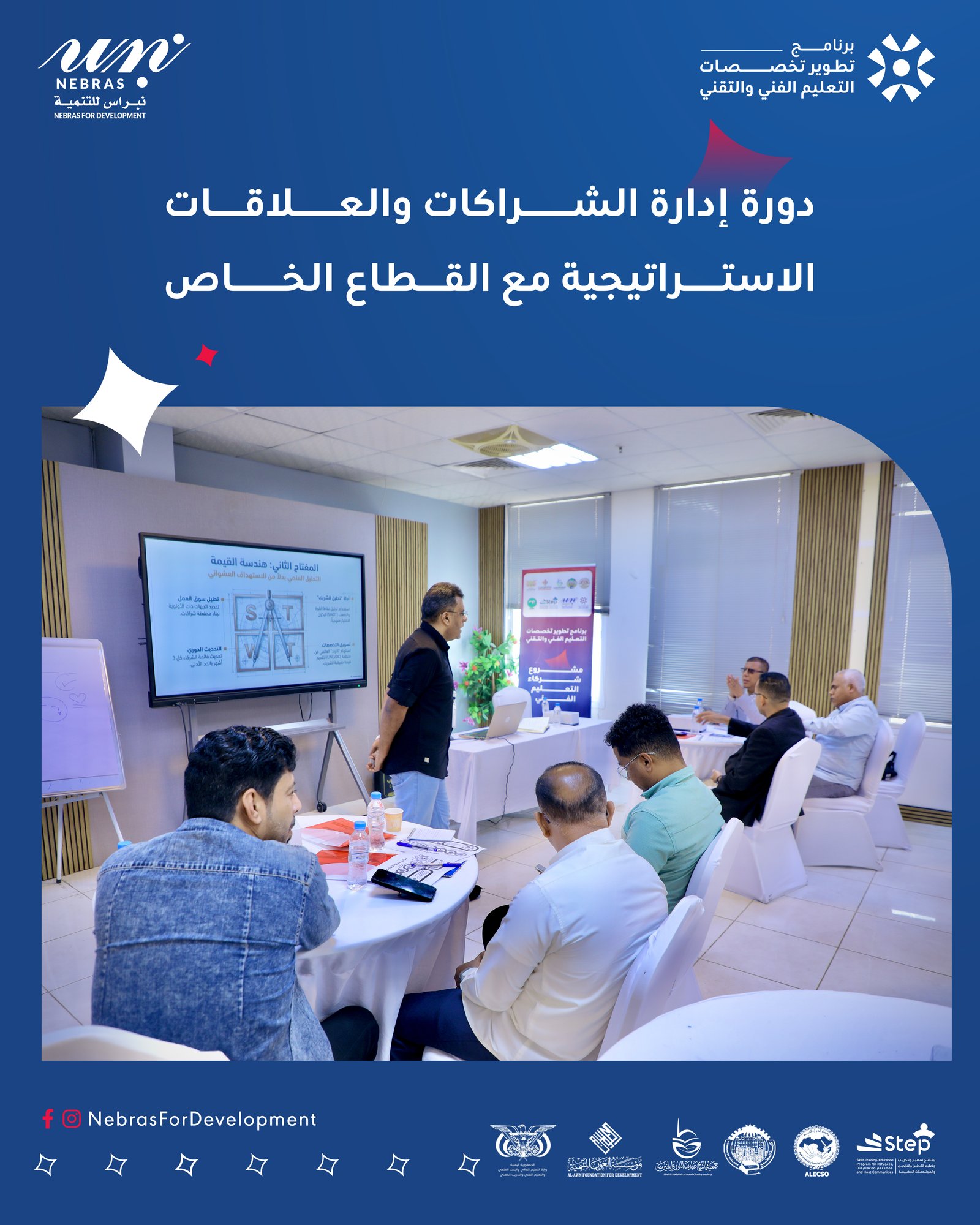 في إطار السعي نحو تعليم فني أكثر مواءمةً لاحتياجات سوق العمل، نُفذت دورة إدارة الشراكات والعلاقات الاستراتيجية مع القطاع الخاص ضمن أنشطة برنامج تطوير التخصصات في التعليم الفني والتقني، وضمن مشروع شركاء التعليم الفني 2026، تجسيدًا لهدف البرنامج في تعزيز الشراكات المؤسسية وبناء جسور فاعلة مع القطاع الخاص.