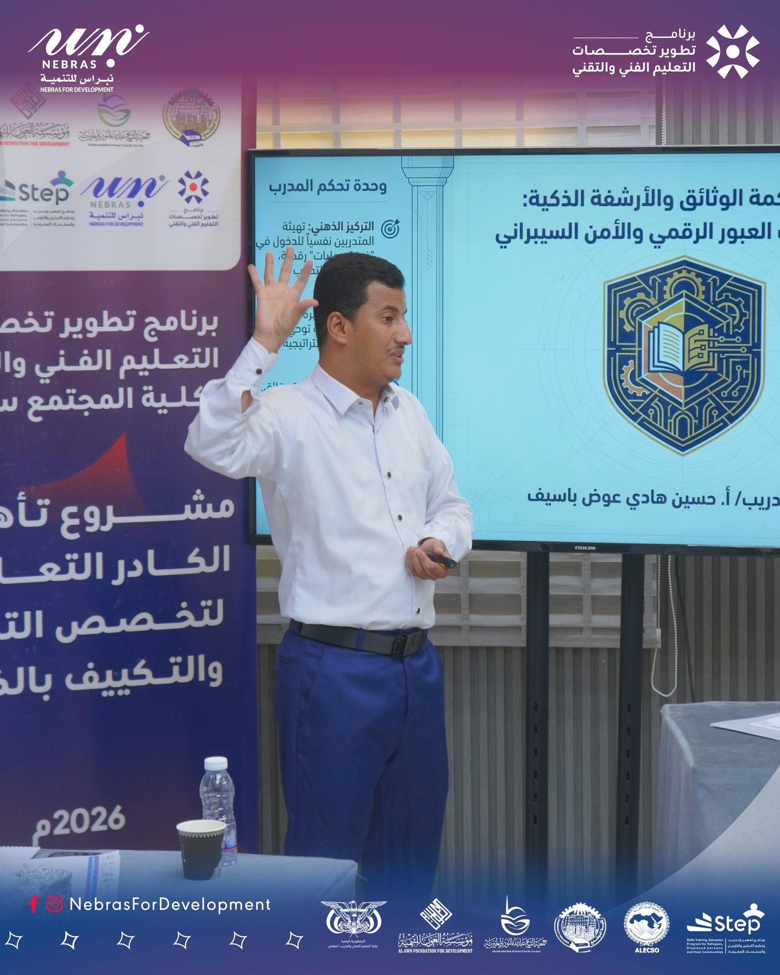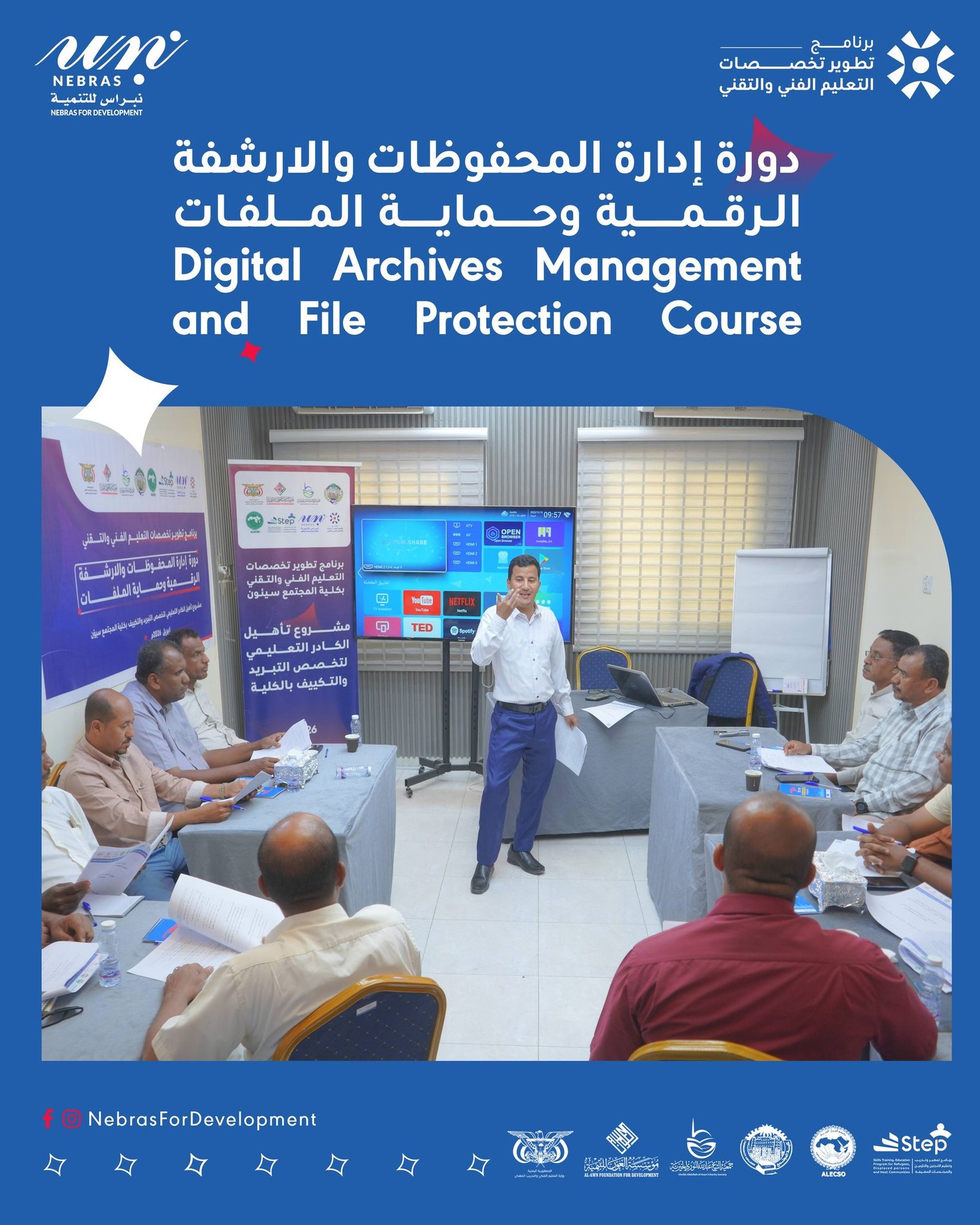 في إطار مشروع تأهيل الكادر التعليمي لتخصص التبريد والتكييف بكلية المجتمع سيئون التابع لبرنامج تطوير تخصصات التعليم الفني والتقني بالكلية، تأتي دورة إدارة المحفوظات والأرشفة الرقمية وحماية الملفات كإحدى المبادرات النوعية التي تهدف إلى بناء تعليم تطبيقي حديث وتطوير الأداء الإداري وتعزيز كفاءة إدارة الوثائق وفق أحدث الممارسات.