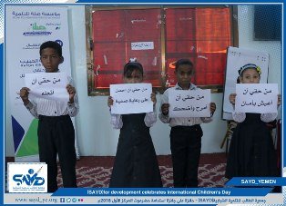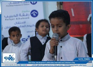 As part of the activities of the Child Protection Program which funded by Selah for development. (SAYD) for development implemented an event on the occasion of International Children's Day for students who benefiting from the project of "Rufqat Al_habeeb". They have been participated with creative paragraphs in their early morning expressing the importance of providing protection for children and contribute to highlight their creativity and talents. The event also included the descent of the project officer to the beneficiaries of the project in their classrooms, their levels and active participation in the classroom. The event concluded with a recreational session for grades (1-3) aimed at refining the talent of speech and speaking in front of others by presenting various paragraphs.
